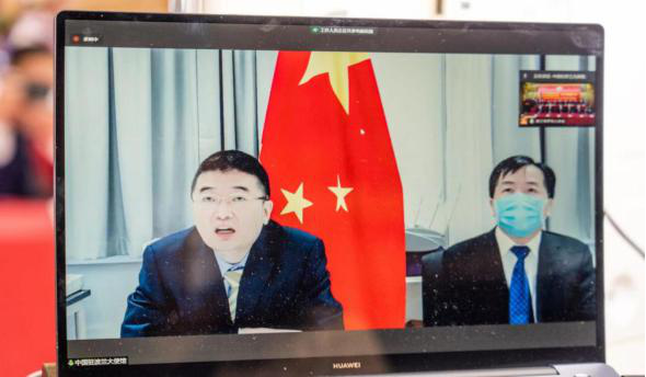 中国驻波兰大使馆赵洋参赞(左一)和领事部主任王占杰(右一)出席视频会议
