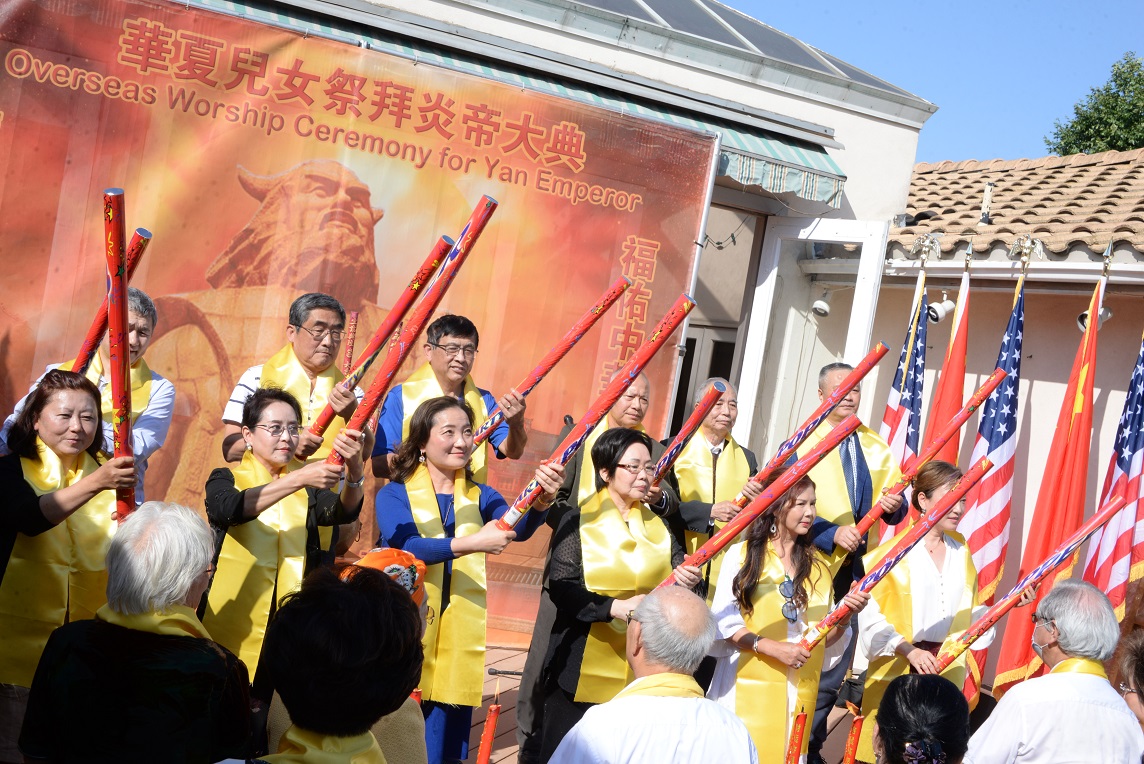 在美国南加州华人社团联合会共同主席团主席赵林主持下,由12位社团代表鸣放世纪礼炮,现场六十多位侨界代表向炎帝神农像鞠躬行拜谒礼,共拜始祖。由美国南加州华人社团联合会创会荣誉主席张素久恭读颂文。