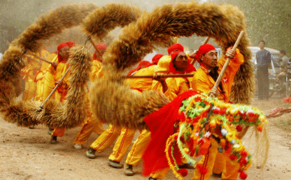 若是有隔门的房子(在堂屋大门两侧开有两副门),便先从中间大门进,行至神龛处,左拐出左门;再从大门进右拐出右门;又入大门,左拐出在广场表演时,舞珠引龙做“龙跑单圈”打场,然后做“舞龙”、“破龙门阵”、“开荷花”、“黄龙盘柱”等动作。每做完一次动作,便跑一次“龙跑单圈”。做“黄龙盘柱”时,舞珠者引龙头带动龙身爬上铁柱,将柱顶端所悬物(香烟、糕点、布料及红纸钱包之类)取下,随后绕柱退下做“荷花形”舞龙。这时,乐队紧锣密鼓,伴之舞龙者发出“啊吙吙”的齐声吼叫,从而造成热烈、激昂的气氛,将草把龙舞推向高潮。草把龙的音乐伴奏主要是打击乐。过去的打击乐器只有一套,其中有小鼓、大锣、小锣、马锣,称为“小样”。现在又增加了一套,即大鼓(双人抬鼓)、对子锣、小锣,称为“大样”。伴奏曲牌是采用布龙灯中的“慢打”和“紧打”,表演时,两种曲牌交替使用。龙在行走时用慢打,龙在舞动并进入高潮时用紧打。两套击乐一起伴奏,音量宏大,除了好听外,更主要的是能调动表演者的激情,使场面热烈壮观。舞草把龙的动作,一要有力度,舞动托把必须力贯双臂,才能将龙滚得开、舞得活。二要讲求“圆”,即把握好身体的重心,双手握把贴身游动划“8”字,其动作要领是:手圆晃动把,把圆带动龙,身体随腿动,腰、臂要放松。夜里舞龙更有一番情趣,龙头、龙身插有点燃的香火,舞动起来香火随龙身运动,线条分明,图案多变,令人赏心悦目。