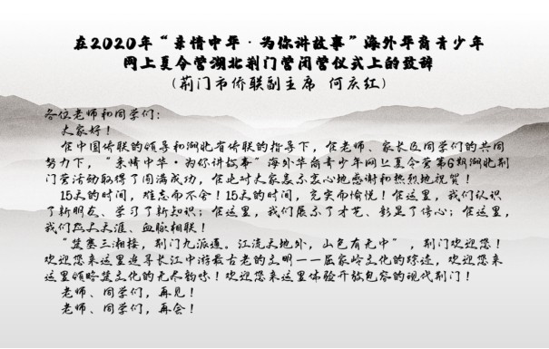 (荆门市365app下载登录_be365体育平台app_旧版彩票365下载楼青峰、京山市365app下载登录_be365体育平台app_旧版彩票365下载杨鹏)7月28日,“亲情中华·为你讲故事”海外华裔青少年网上夏令营第6期湖北荆门营闭营仪式在网上举行。15天的时间里,来自美国的60余名海外华裔青少年在网上度过了一个特殊意义的网上夏令营。营员们一起收获了知识、友谊、快乐,共同见证了夏令营的圆满成功。