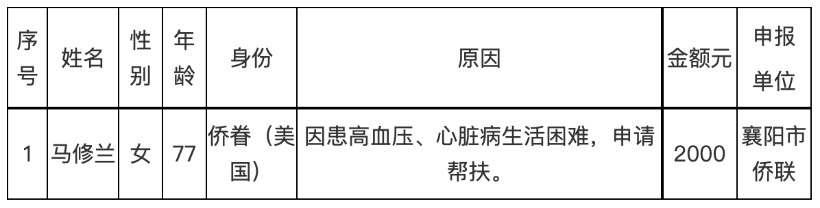 襄阳市365app下载登录_be365体育平台app_旧版彩票365下载向扶贫帮困基金会提交了一份困难补助申请,按照《湖北省归国华365app下载登录_be365体育平台app_旧版彩票365下载合会扶贫帮困基金使用办法》有关条款,经省365app下载登录_be365体育平台app_旧版彩票365下载党组会、省365app下载登录_be365体育平台app_旧版彩票365下载扶贫帮困基金理事会研究决定,给马修兰1名申请人进行补助,现予以公示。