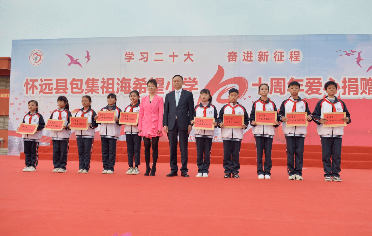 李世蕴、邝远平一行还出席了怀远县包集祖海希望小学成立十周年爱心捐赠活动。邝远平代表湖北省企业家爱心基金携手安徽省蚌埠籍着名歌唱家祖海、爱心企业共同向祖海希望小学捐赠了170余万元和一大批校服、足球、乐器等物资,用于关爱农村儿童成长。