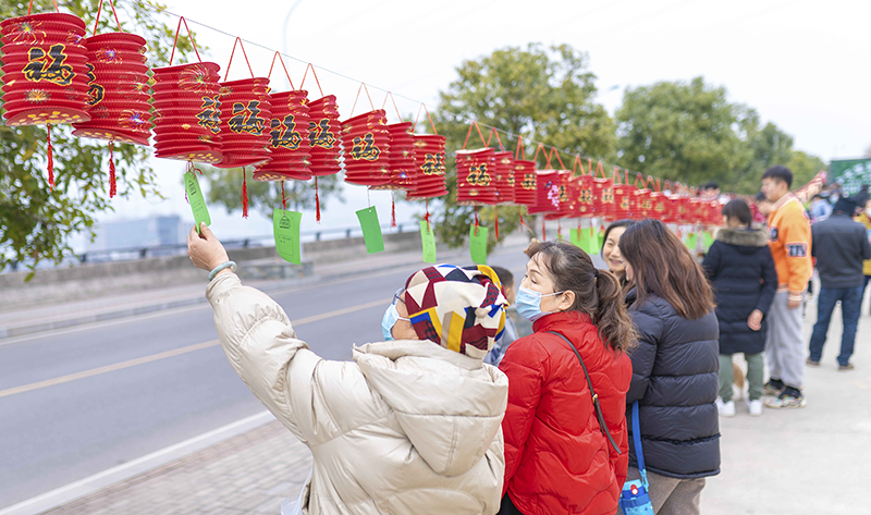 在镇境山社区,明珠广场内锣鼓喧天、喜气洋洋,以“我们的节日·精神的家园”为主题的元宵喜乐汇在此上演。“乔装打扮人更娇,谜底为‘侨’字......”100多条谜语悬挂在灯笼上,引来不少居民抢摘谜语。文艺表演、反诈宣传......猜不完的灯谜、说不够的吉祥话、道不完的节日情,侨胞侨眷和居民群众尽享欢乐时光。