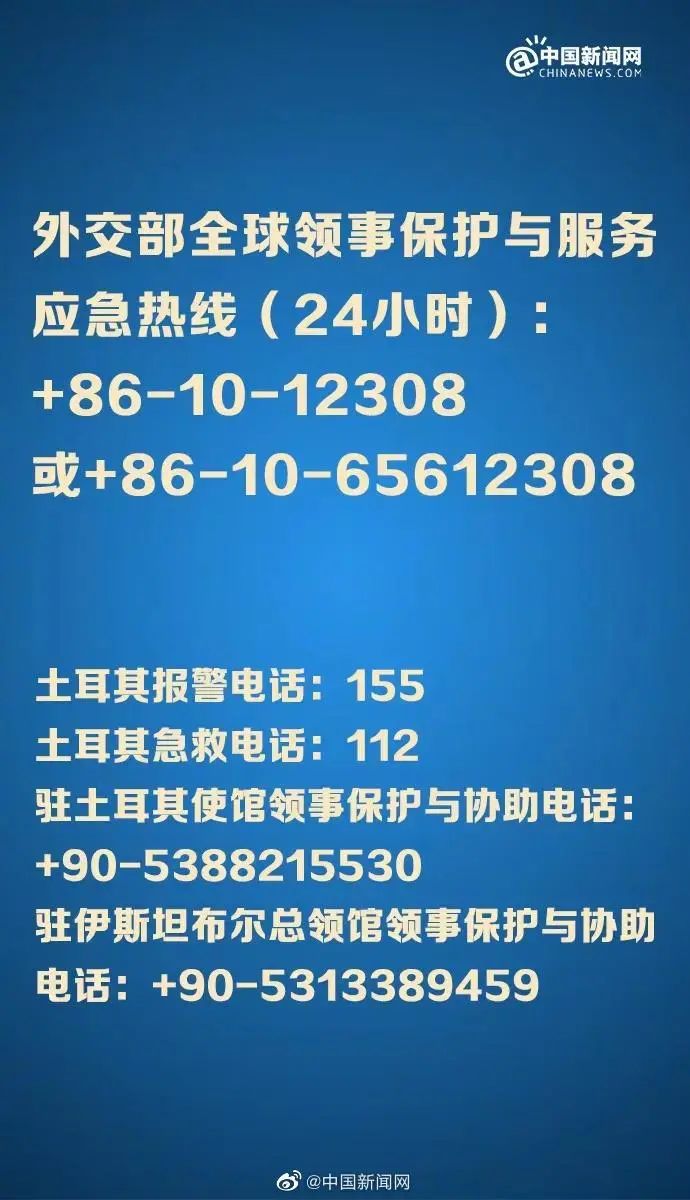驻土耳其使馆领事保护与协助电话:+90-5388215530