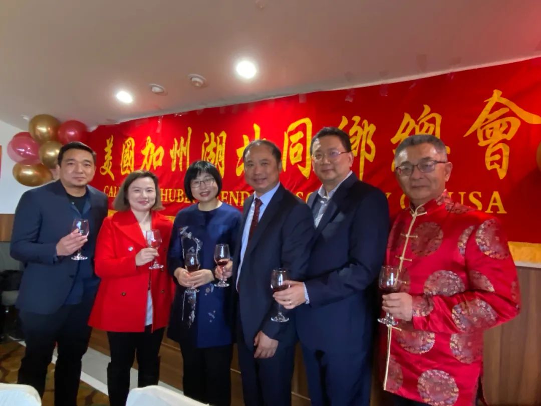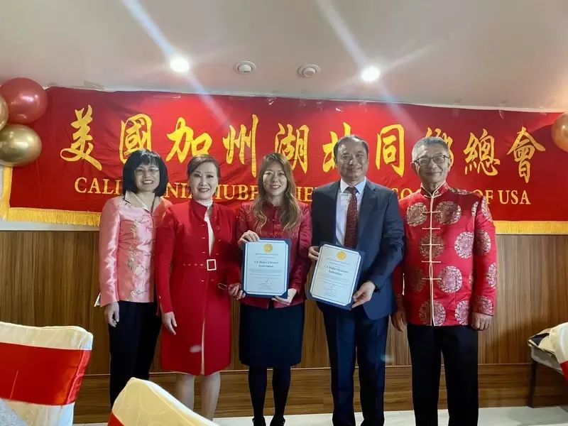 加州州政府财务长马世云(中),加州众议员朱感生(右一),萨拉度加副市长赵嬿(左一),海外楚商联合会会长、美国加州湖北同乡总会会长、湖北省侨商协会会长喻鹏(右二),美国加州湖北同乡总会执行会长谭玥(左二)出席活动。
