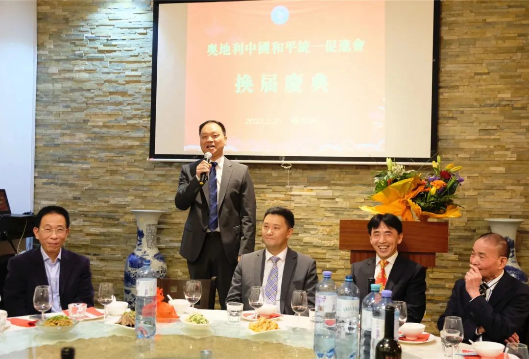 中国驻奥地利大使馆余锋参赞在致辞中首先代表使馆杨文旭代办对奥地利中国和平统一促进会换届庆典表示热烈祝贺,并对和统会工作给与肯定和期盼。他在讲话中对奥地利和统会三届理事会在姚龙伟会长带领下所取得的工作成绩予以肯定,对司良信博士当选第四任会长表示祝贺,对和统会及旅奥侨界对使馆工作的支持表示衷心感谢!