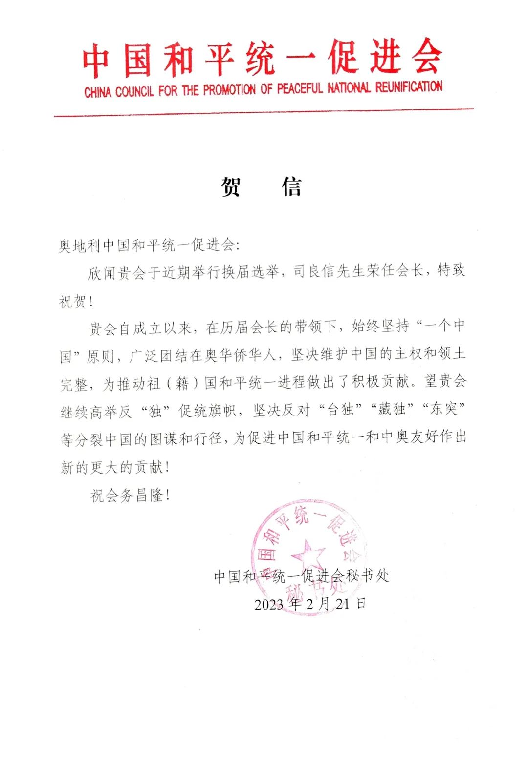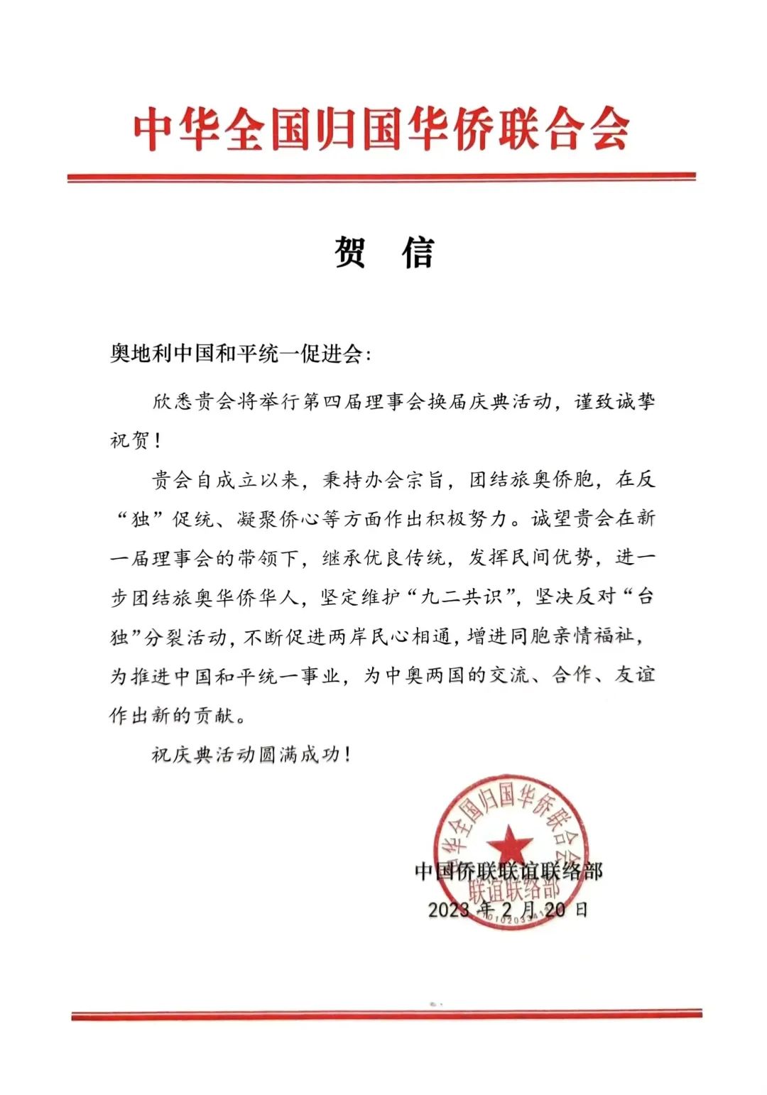 同时,希望奥地利中国和平统一促进会坚定不移加强全奥侨界团结,努力寻找最大公约数,好画最大同心圆,号召广大侨胞都来支持祖国完全统一这项事业,使“统一有我、复兴有我”成为全奥侨胞的共同心声,使支持祖国统一、民族复兴的力量薪火相传、日益壮大。