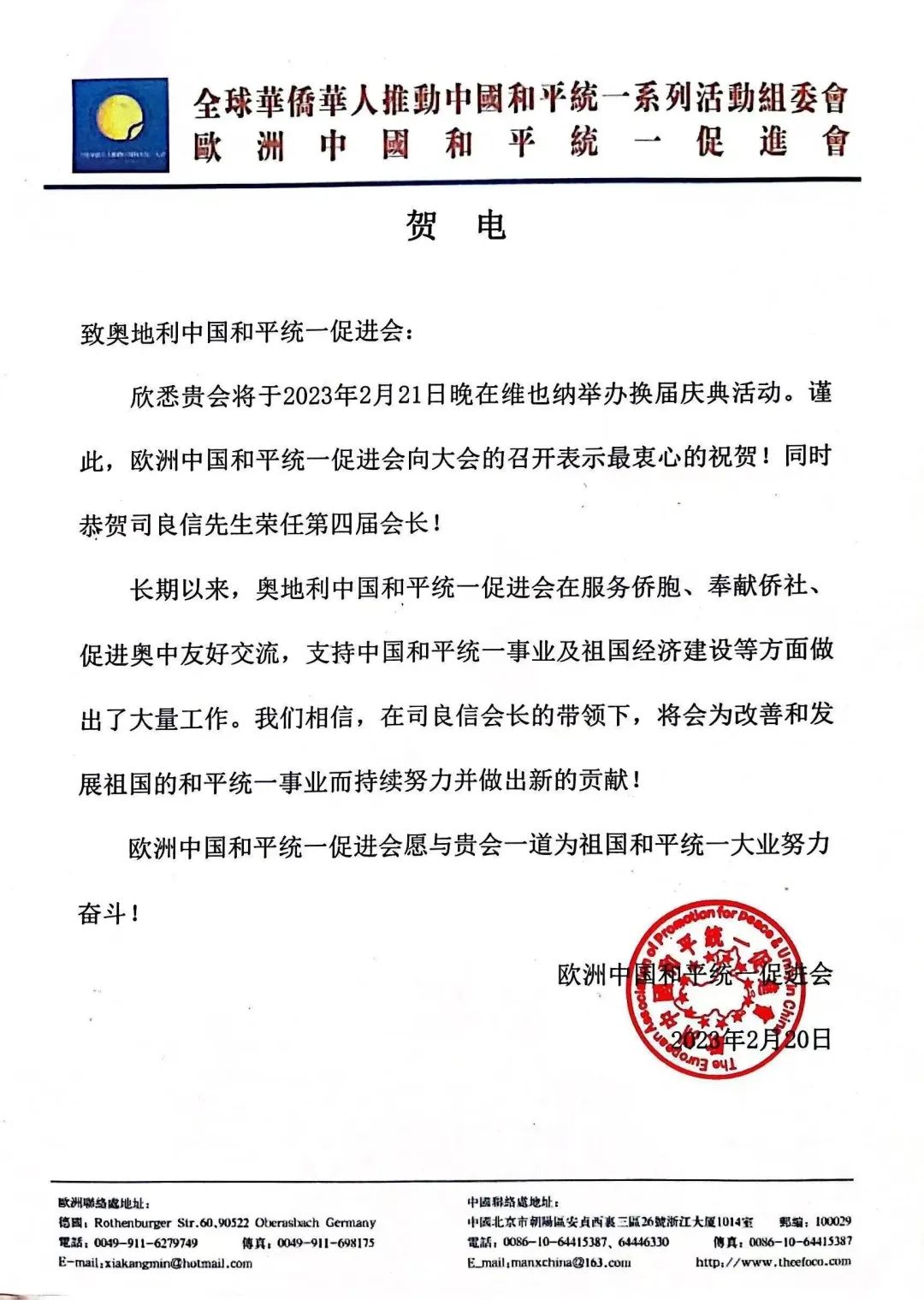 庆典上,秘书长吴永胜宣读了贺电。中国和平统一促进会、中国365app下载登录_be365体育平台app_旧版彩票365下载及国内省市级涉侨部门、欧洲华侨华人社团联合会与奥地利各兄弟侨团及海外统促会组织共发来70余份贺电、贺信,对奥地利和统会换届庆典表示热烈祝贺!